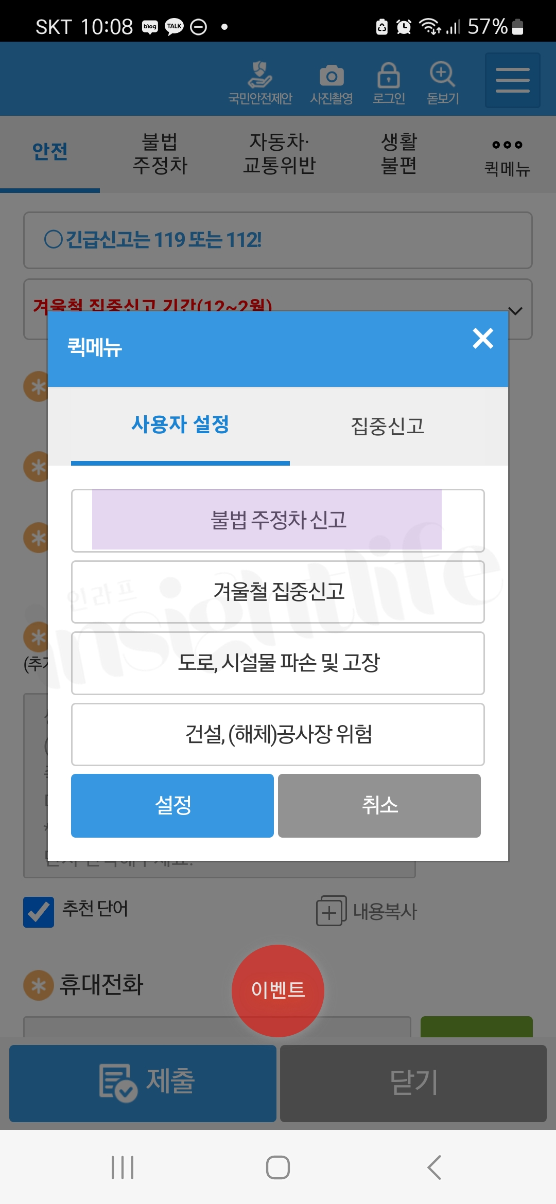 그리고 실행을 하면 팝업, 즉 퀵메뉴로 바로 '불법 주정차 신고' 메뉴가 뜨는데 여기를 클릭하여 신고하시면 됩니다.