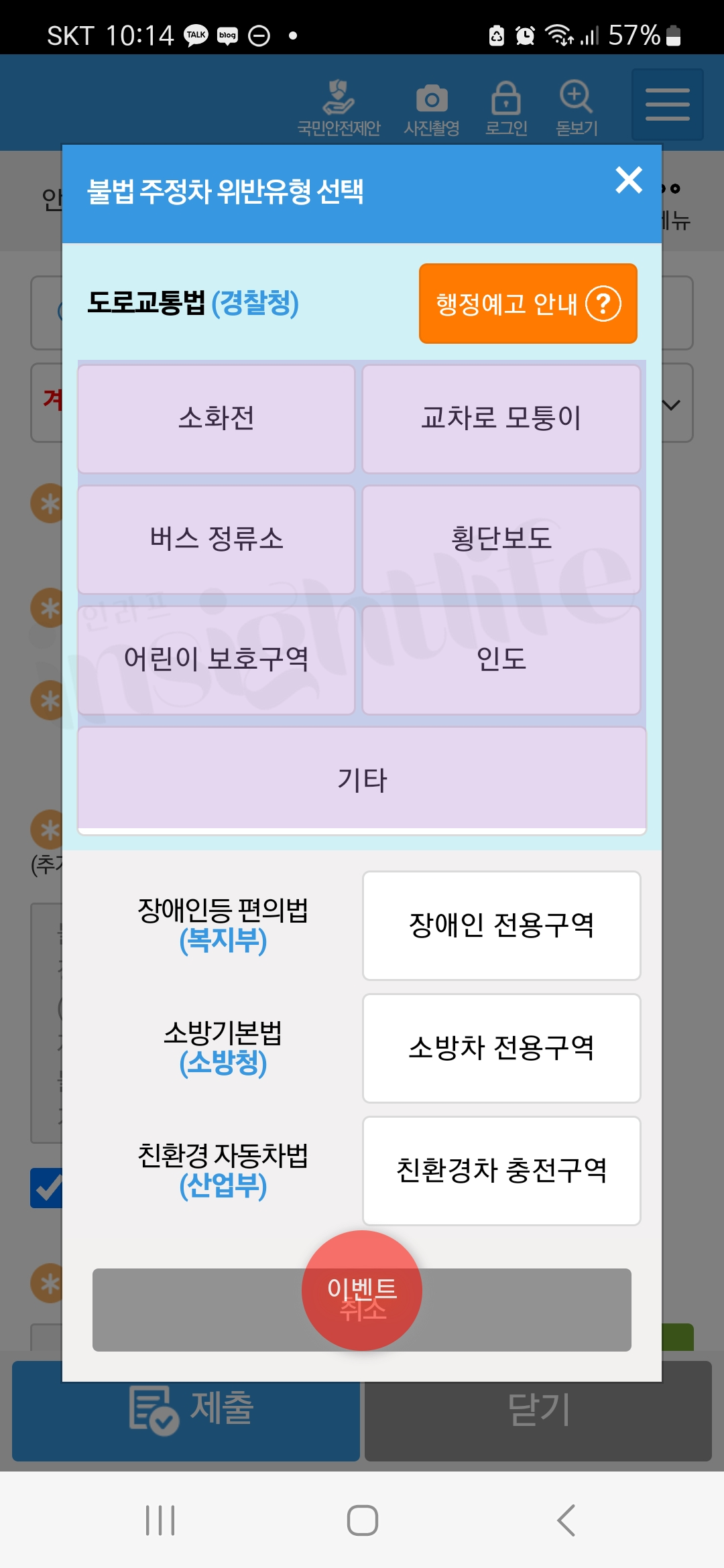 불법 주정차 위반 유형 중 맞는 것을 선택 후 사진을 첨부하기 바랍니다.