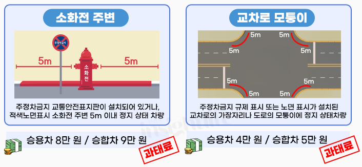 교차로 모퉁이에서 5미터 이내 구역에 차량을 주정차하는 것은 교통 흐름을 방해하고, 사고의 위험을 높이므로 금지되어 있습니다.