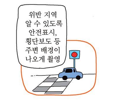 ✔ 위반 지역임을 알 수 있도록 안전표시, 횡단보도 등 주변 배경이 나오게 촬영
